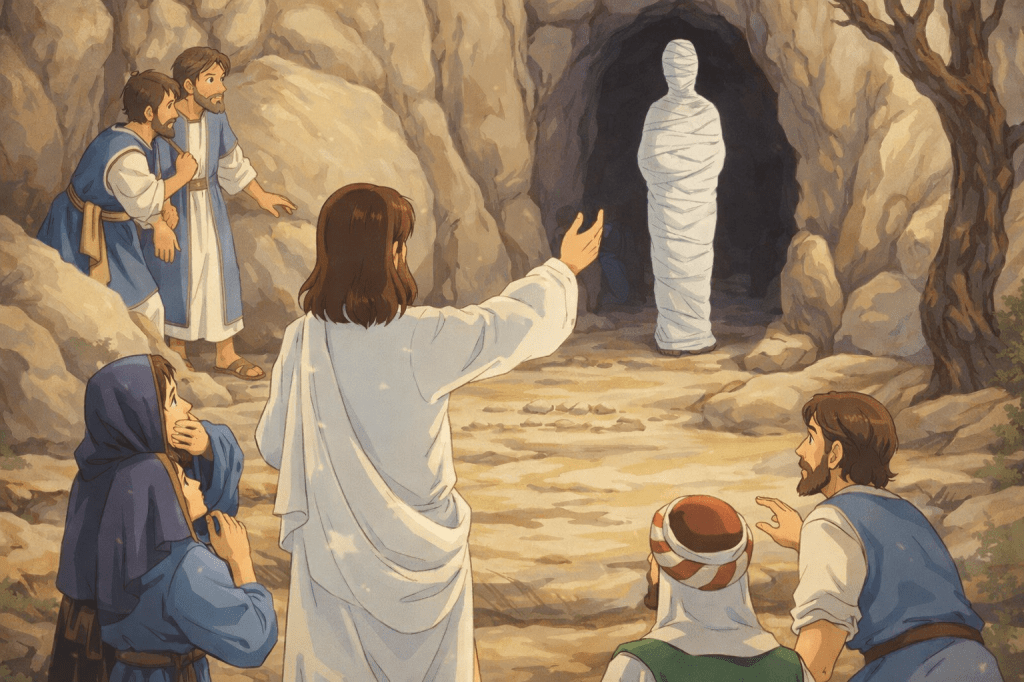 The Bible says the man who had died came out. His hands and feet were bound with linen strips, and his face was wrapped with a cloth. Jesus then commanded, “Unbind him, and let him go.”