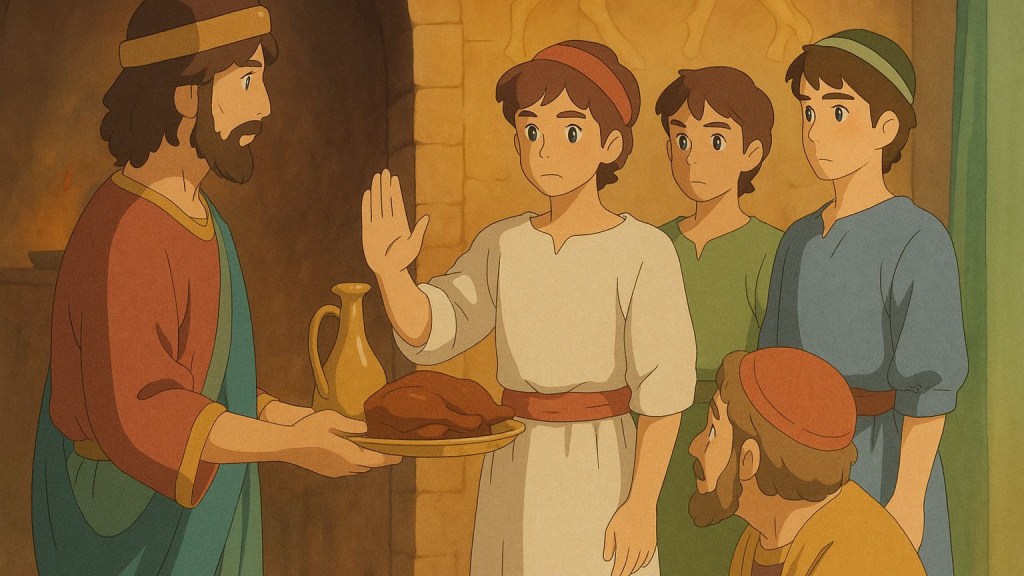 But when the king’s delicacies were offered, Daniel refused. Humbly and firmly, he denied himself the wine and food that would defile him and break his covenant with God. Instead, he requested permission to be given vegetables and water. At first, the official feared that if Daniel and his friends looked weaker than the others, the king would be furious. But Daniel pleaded to be tested for ten days.