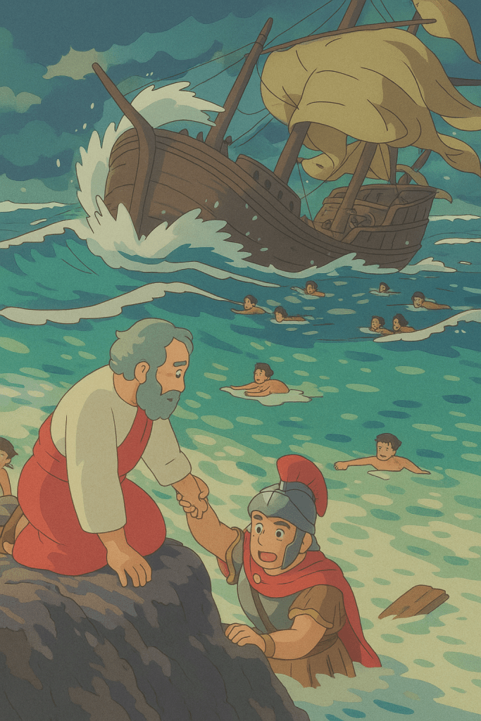 As the storm raged on, the sailors sensed land and dropped anchors. At dawn, they tried to steer toward the shore, but the ship hit a sandbar and began to break apart. Yet, just as God had said, not one life was lost—some swam, others clung to planks, and all reached the shore safely.