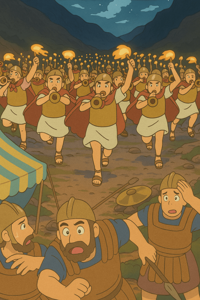 With his small force, Gideon advanced and surrounded the enemy from three sides. During the change of guard, they broke jars, lifted torches, and blew trumpets. The camp was thrown into confusion. The Midianites turned their swords against one another and fled in terror. Gideon and his men pursued them and defeated them, along the very route the Midianites once used to torment Israel.