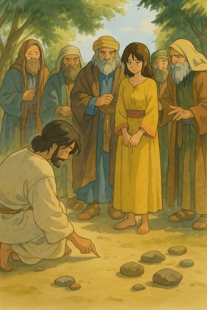 The religious leaders brought her before Jesus to see how He would respond. Jesus stooped down and began writing in the dust with His finger. When they kept pressing Him for an answer, He stood up and said, “Let the one who has never sinned throw the first stone.” Then He stooped down again and continued writing.